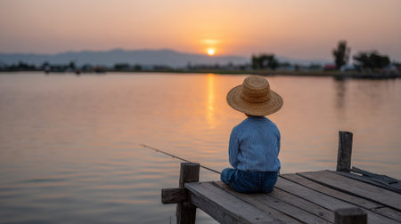 A young child sits peacefully on a wooden dock, fishing at sunset, surrounded by serene water and a breathtaking landscape, embodying tranquility and joy.