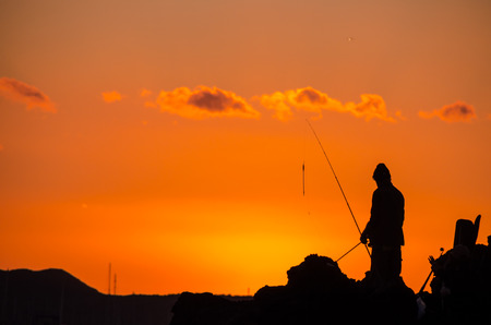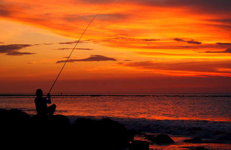 Silhouette of a fisherman with a fishing rod at sunset.