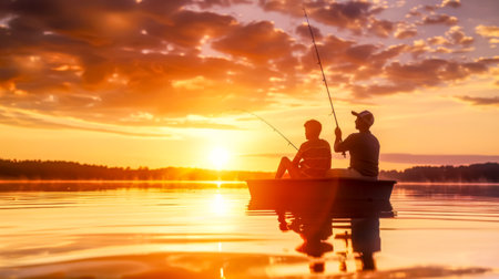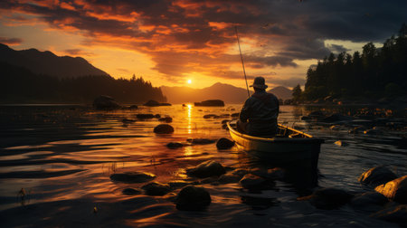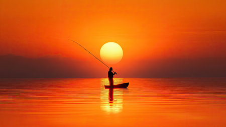 A silhouette of a person fishing from a boat at sunset. The image displays a vibrant orange sky with the silhouette of trees and water. The scene likely takes place outdoors. This image has commercial potential for various uses.