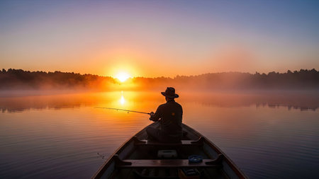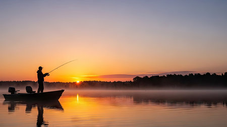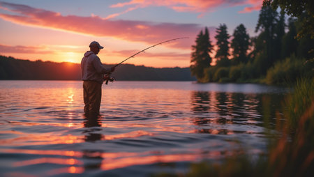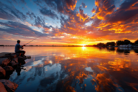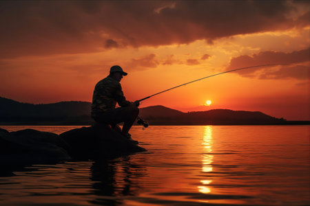Fisherman enjoying a peaceful sunset at the lake while casting a line into calm waters
