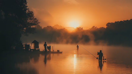 Serene fishermen casting lines at sunrise enveloped in a misty river landscape.