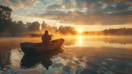 Fisherman sitting on a boat and fishing on a foggy lake at sunrise