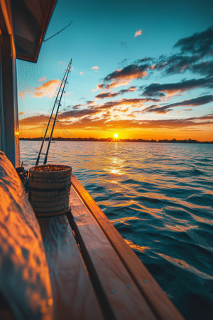 Fishing boat casting nets during sunset on the open sea, showcasing the daily life of fishermen in tranquil waters