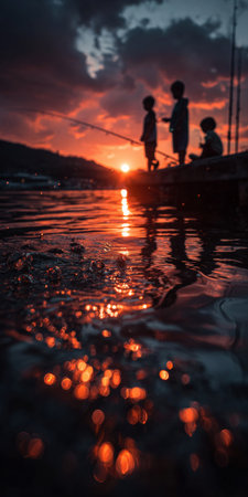 Three children fishing on a wooden pier at sunset, creating a serene and picturesque scene filled with joy and togetherness