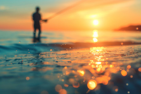 Calm sea surface sparkles at sunset with a fisherman in the background