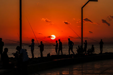 People fishing and walking at sunset on Maltepe coastal road
