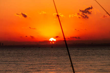 Colorful sunset with fishing rod on ocean. Silhouette of people and fishing rods.