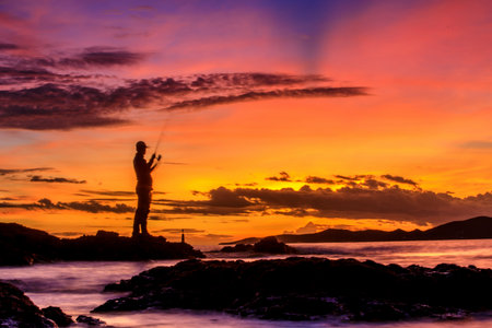 Silhouette of young man fishing on the rocks holding fishing rod in phuket Thailand
