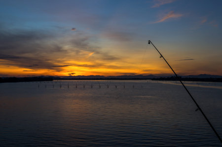 Fishing rod and reel on the sea and sunset sky.