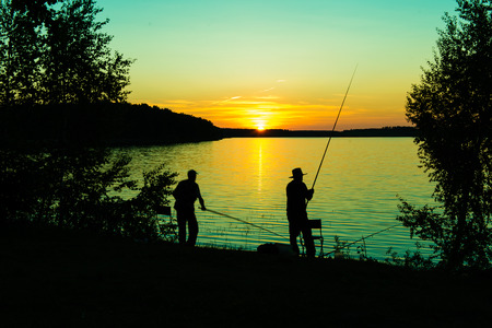 Silhouette of man fishing rod sunset background.