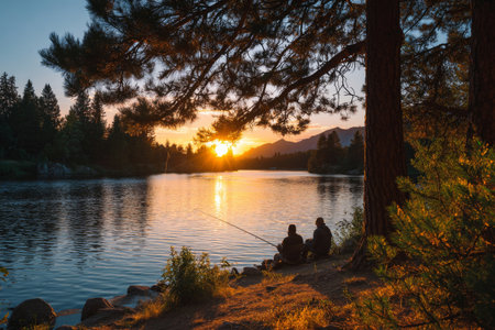 Fishing by the Forest Lake at Sunset. Tall pine trees, calm water, and distant mountains, capturing a peaceful and relaxing outdoor scene. Male Friendship