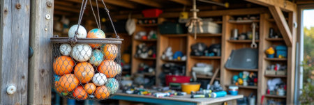 Basket of colorful orange and white balls hanging in rustic workshop with shelves of tools.