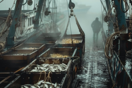 Close-up of a commercial fishing boat s deck, showcasing various types of fish, nets, and fishing equipment, with focused crew members at work
