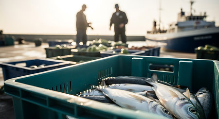 Glistening silver fish float in a fishing basket on crystal clear turquoise water, with a colorful fishing boat and nets in the background, highlighting sustainable fishing