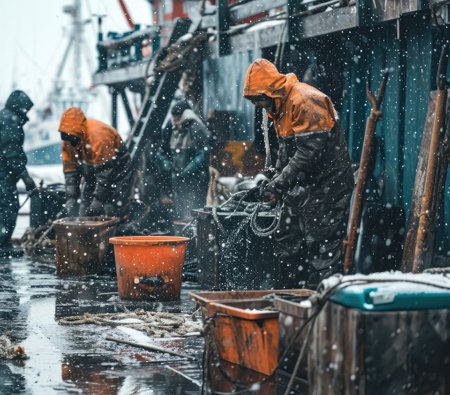 Fishermen braving harsh weather on a fishing boat, showcasing dedication amid stormy waves. The image illustrates the challenges of marine work and teamwork.