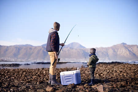 Lets throw it in the deep. Shot of a father and son standing with their fishing gear by the sea.