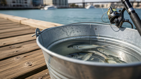 Fresh catch of fish in metal bucket on dock by waterfront.