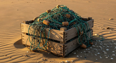 A Box Filled With Various Types of Fishing Gear, Equipment used by a deep-sea fisherman, including rods, nets and baits, AI Generated