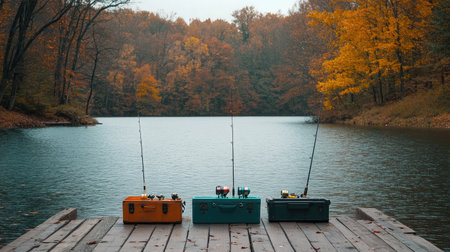 A serene fishing spot surrounded by vibrant autumn foliage, featuring colorful fishing rods and a calm lake, perfect for outdoor enthusiasts seeking tranquility and adventure.