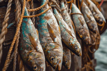 A fisherman with a fresh catch of fish in a net, on a boat at dawn. Evokes tradition, sustainable seafood, and the serene beauty of coastal life.