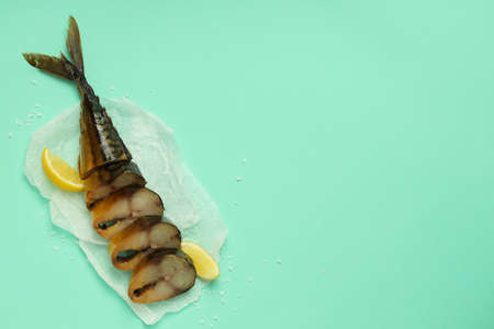Concept of tasty food with smoked mackerel, space for text