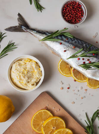 Raw Mackerel fish with salt, lemon and spices on light background. fresh seafood. Culinary, cooking fish concept. banner, menu, recipe place for text, top view.