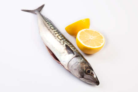 Fresh raw mackerel fish or Scomber scrombrus. Isolated over white background