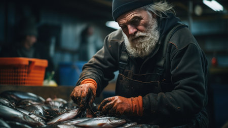 Ancient Fisher: Old Fisherman Sorting Fish. Generative AI