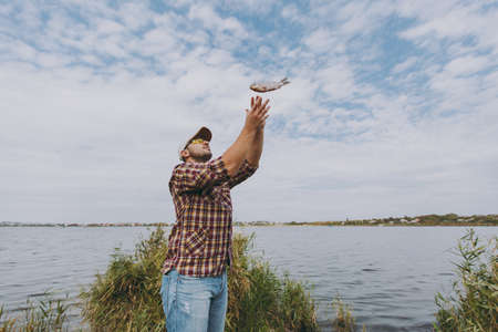 Young unshaven smiling man in checkered shirt, cap and sunglasses caught a fish and throw it up on the shore of lake on background of water, shrubs and reeds. Lifestyle, recreation, leisure concept.