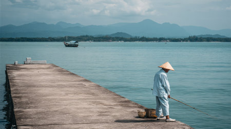 An elderly asian man is seen fishing with a rod and net in a tranquil river setting. The image captures the essence of patience, nature, and the traditional art of fishing.