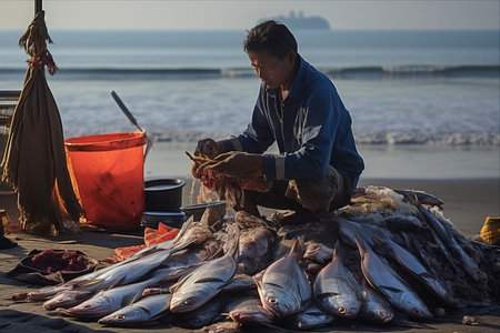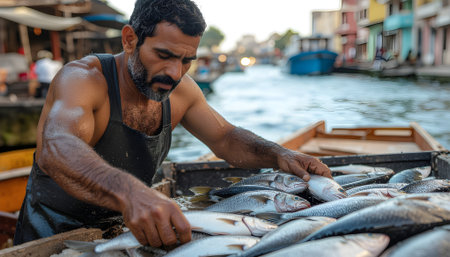 A fisherman with a fresh catch of fish in a net, on a boat at dawn. Evokes tradition, sustainable seafood, and the serene beauty of coastal life.
