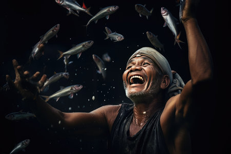 A Painting of a Man Holding a Fishing Net, An old fisherman pulling in a large net filled with various types of fish, AI Generated
