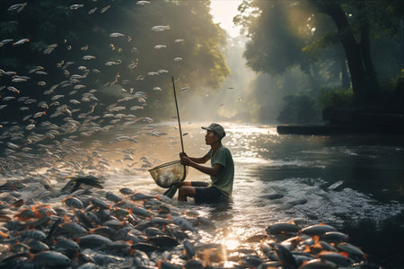 A fisherman sorting his catch by the riverside in the early morning light, showcasing traditional fishing practices in a serene natural setting