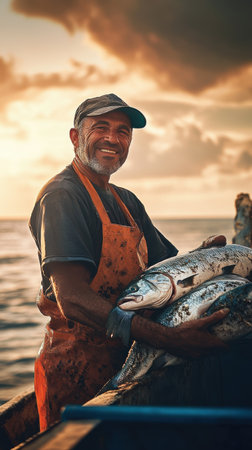 A skilled fisherman stands proudly on his boat at sunset, showcasing a bountiful catch. The warm glow of the setting sun reflects on the water, highlighting the passion for his craft.