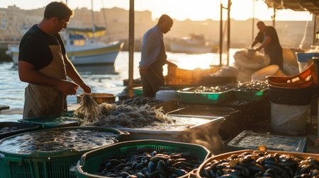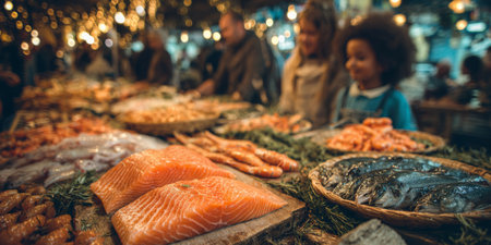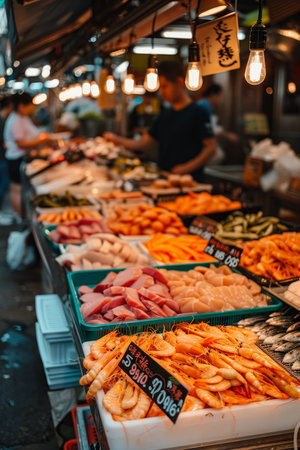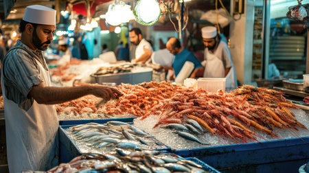 Fresh seafood market bustling with activity during the evening, showcasing a variety of fish and shellfish with warm lights