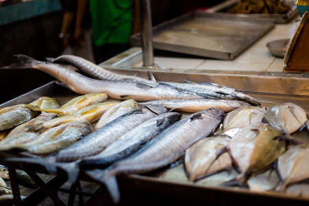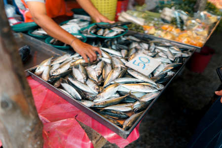Selection of thai raw fishes on local market in Krabi. Traditional way of selling fresh seafood in south east Asia.