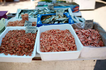 Dried fish and grilled boiled shrimp on stall on summer market for sale. Salted local seafood. Fishing concept.