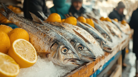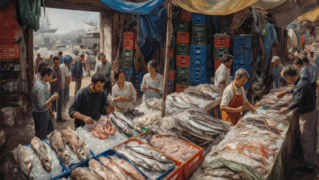 A vibrant scene captures fresh fish on ice, showcasing a busy marketplace where shoppers browse seafood stalls filled with local culinary delights.