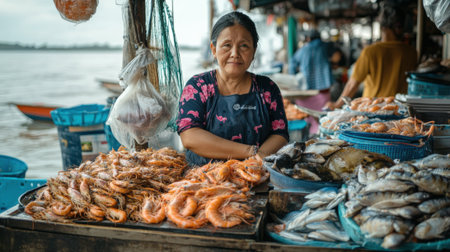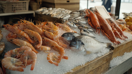 Fresh Seafood Display Vibrant Fish Market Stall with Variety of Seafood and Shrimps in Foreground