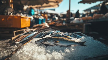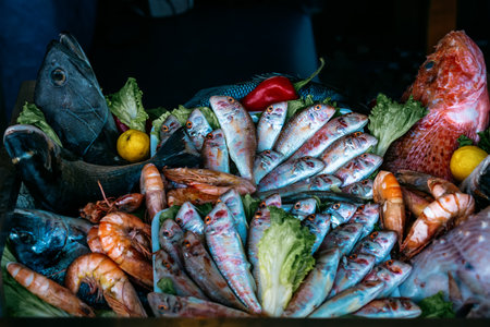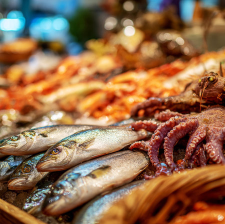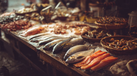 Explore a traditional market scene showcasing a colorful array of fresh seafood. The vibrant display highlights various fish and shellfish, emphasizing the rich textures and natural beauty of local culinary treasures.