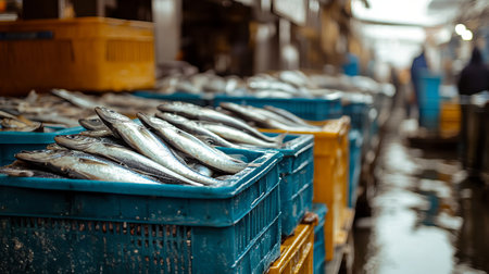 A vibrant market scene featuring stacks of crates filled with freshly caught fish. This image captures the essence of local seafood trade and the bustling activity of vendors.