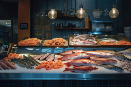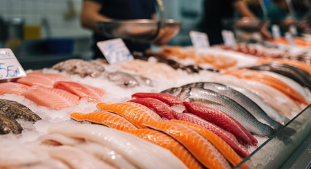 Vibrant fish shop display features an array of fresh seafood on ice, highlighting various fish types and textures, creating an inviting atmosphere for shoppers and food lovers