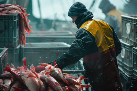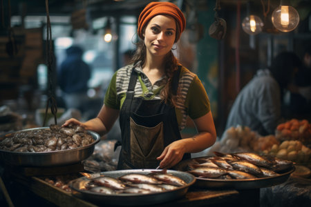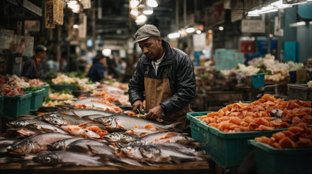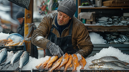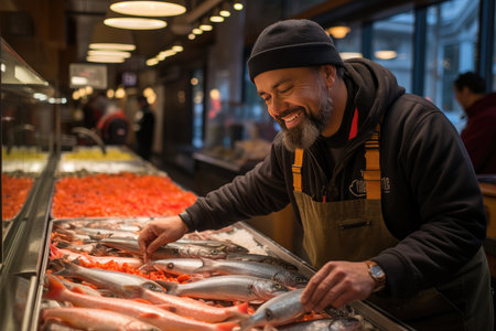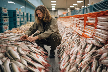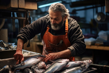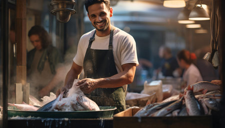 A skilled chef wearing an apron is seen meticulously working on some fish in order to create a delicious and flavorful seafood dish, fishmonger picking fish in fish market, AI Generated