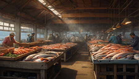 A bustling seafood market with various types of fish displayed in rows, employees attending to customers, and hanging lamps illuminating the scene.