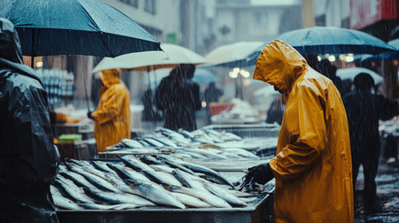 Seafood market in Istanbul, Turkey. A man in a yellow raincoat and a woman in a raincoat with an umbrella.