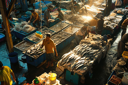 A vibrant and busy fish market with numerous vendors selling a variety of fresh fish laid out on stalls. Customers are seen browsing and making purchases, creating a lively atmosphere.