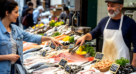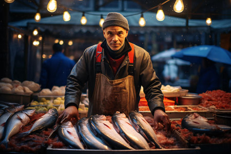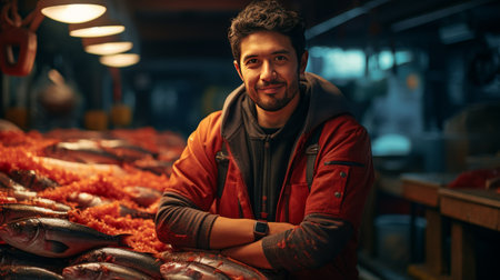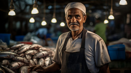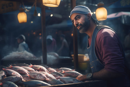 Arabian fish seller market. Eastern fisherman trading seafood on bazaar. Generate ai