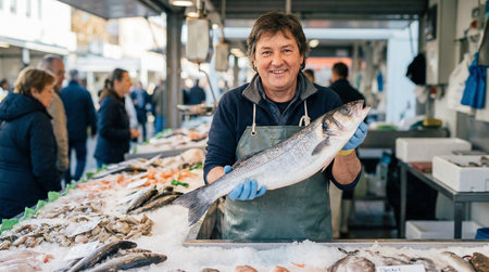 Mature man selling fresh fish on the fish market in Barcelona, Spain