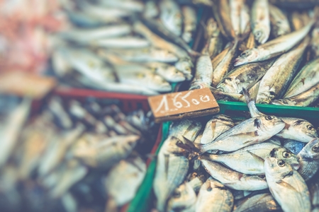 Fresh fish at local traditional market in Hue, Vietnam. Selective Focus.