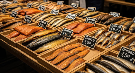 Assortment of smoked fish varieties in wooden trays, highlighting vibrant colors and textures, with price tags indicating quality and freshness in a lively fish shop atmosphere